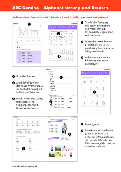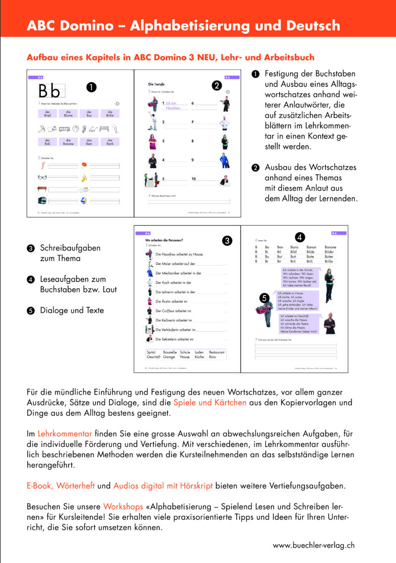 In ABC Domino 3 NEU werden alle Buchstaben anhand von Alltagsthemen systematisch repetiert, der Lese- und Schreibfluss wird gefördert und der Wortschatz auf Deutsch wird ausgebaut.