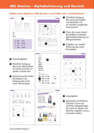 In ABC Domino 1 NEU und ABC Domino 2 NEU wird jeder Buchstabe einzeln eingeführt und auf vielfältige Weise zusammenlauten und möglichst in einem alltäglichen Kontext schreiben gelernt.